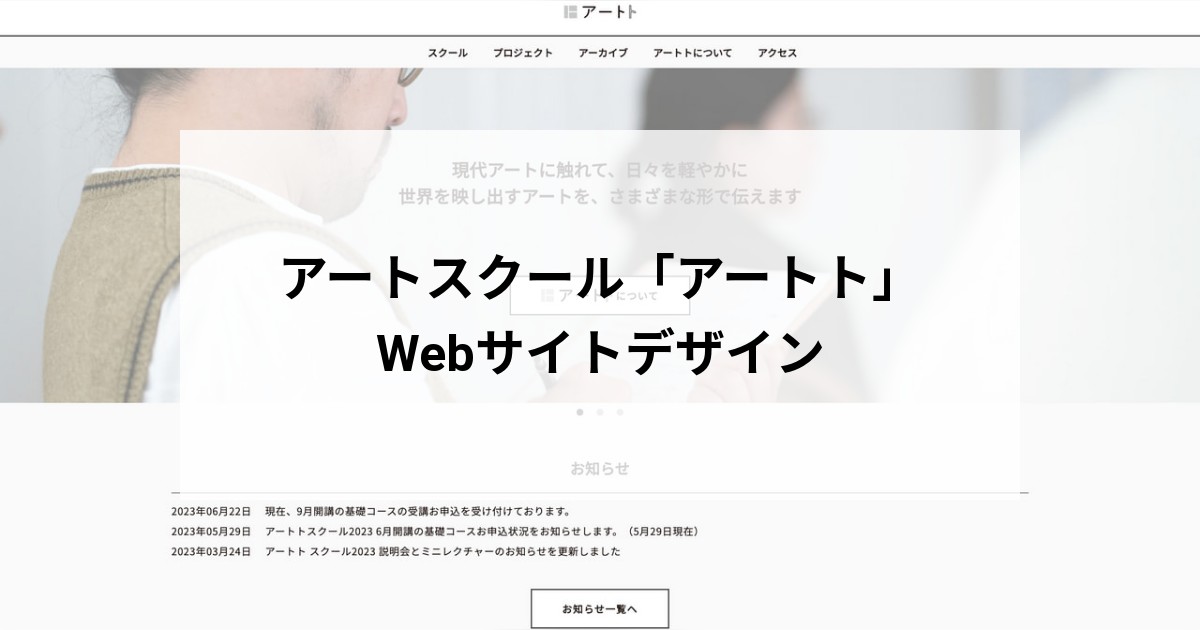 東京都・清澄白河のアートスクール「アートト」のWebサイトリニューアルのデザイン・マークアップを担当しました。 クリーンでモダンな印象を与える、白と黒を基調としたシンプルなデザインや、アートトのスクールの雰囲気や過去に開催された展示が魅力的に伝わるよう、写真を大きく使用するブロックレイアウトを意識しました。